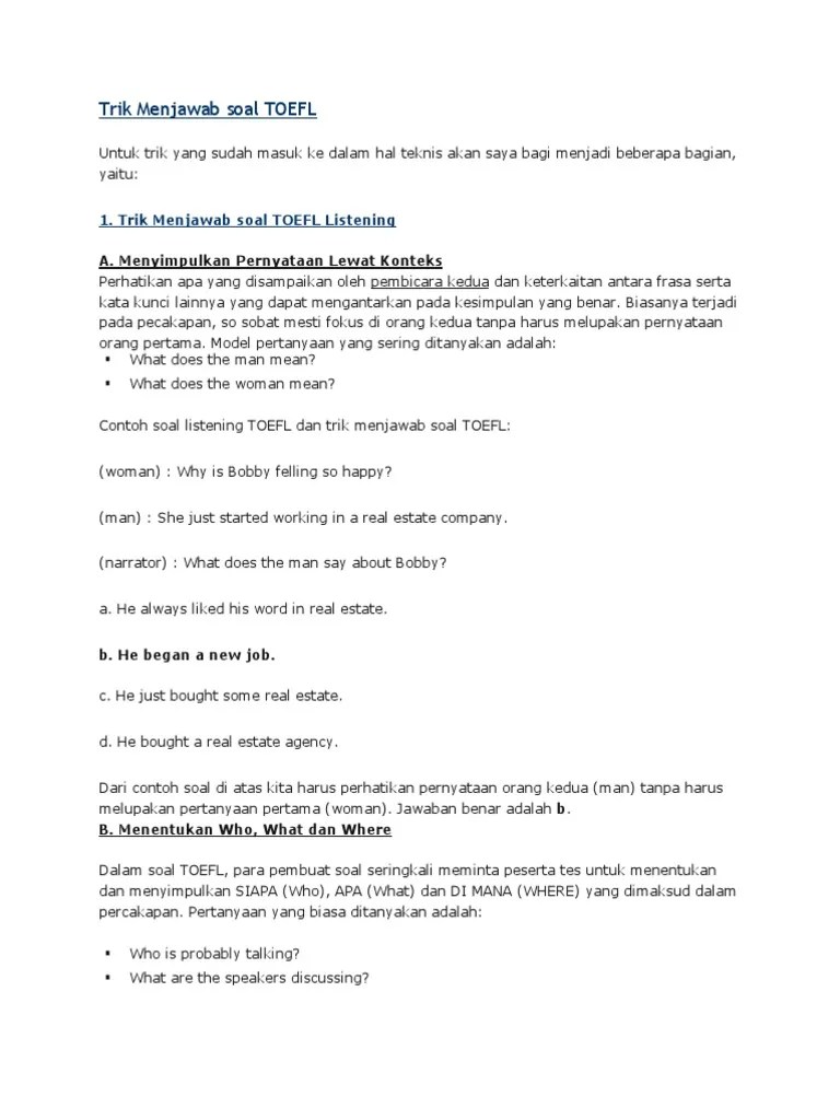 Download soal listening toefl kunci jawaban pdf audio longman pre test. Tips menjawab soal toefl reading strategi menjawab soal toefl reading trik toefl sharing tips dan strategi toefl tembus skor toefl 600 dari pengalaman pribadi dan referensi toefl yang relevan info benpinter. trik menjawab soal toefl structure. trik menjawab soal toefl listening a. Atau orang kedua yang ada di percakapan soal listening tersebut.